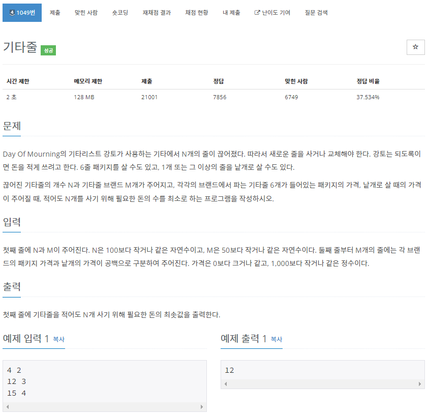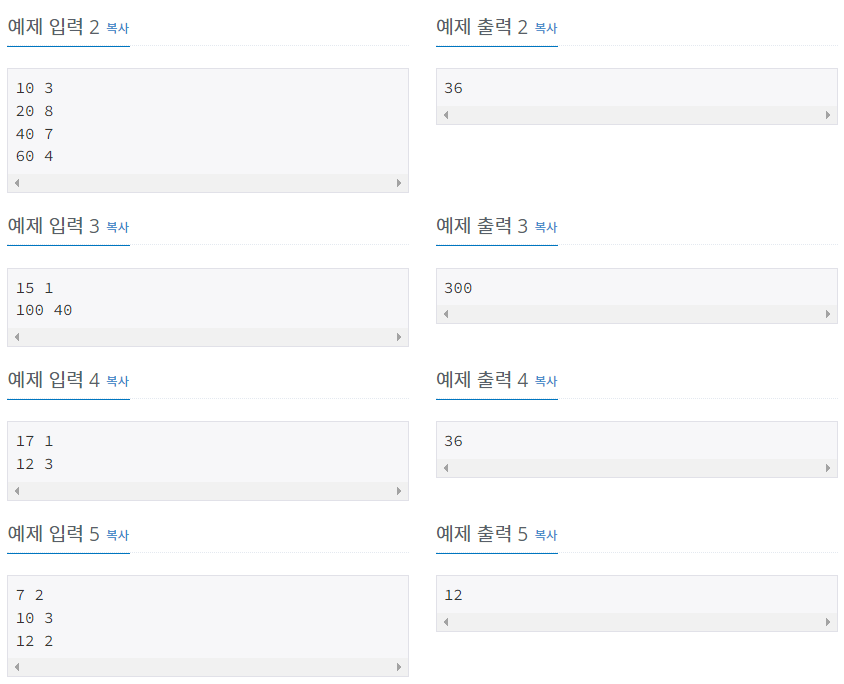 첫째 줄에 N과 M이 주어진다. N은 100보다 작거나 같은 자연수이고, M은 50보다 작거나 같은 자연수이다. 둘째 줄부터 M개의 줄에는 각 브랜드의 패키지 가격과 낱개의 가격이 공백으로 구분하여 주