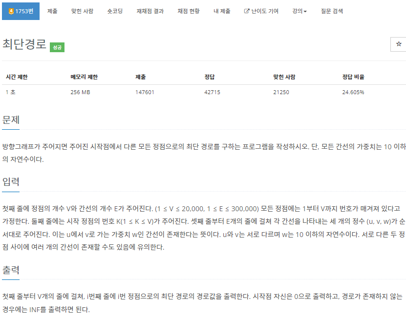 첫째 줄에 정점의 개수 V와 간선의 개수 E가 주어진다. (1 ≤ V ≤ 20,000, 1 ≤ E ≤ 300,000) 모든 정점에는 1부터 V까지 번호가 매겨져 있다고 가정한다. 둘째 줄에는 시작 정점의 번호 K(1 ≤ K ≤ V)가