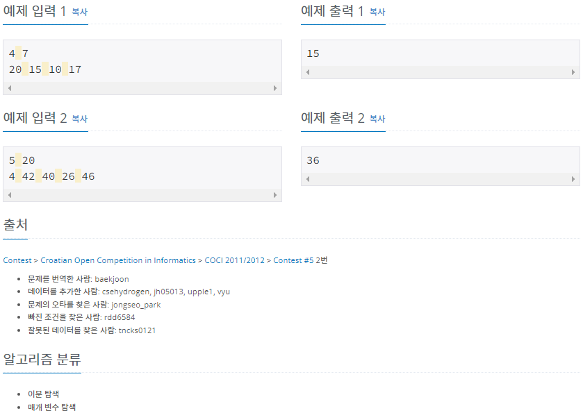 첫째 줄에 나무의 수 N과 상근이가 집으로 가져가려고 하는 나무의 길이 M이 주어진다. (1 ≤ N ≤ 1,000,000, 1 ≤ M ≤ 2,000,000,000) 둘째 줄에는 나무의 높이가 주어진다. 나무의 높이의 합은 항상 M보
