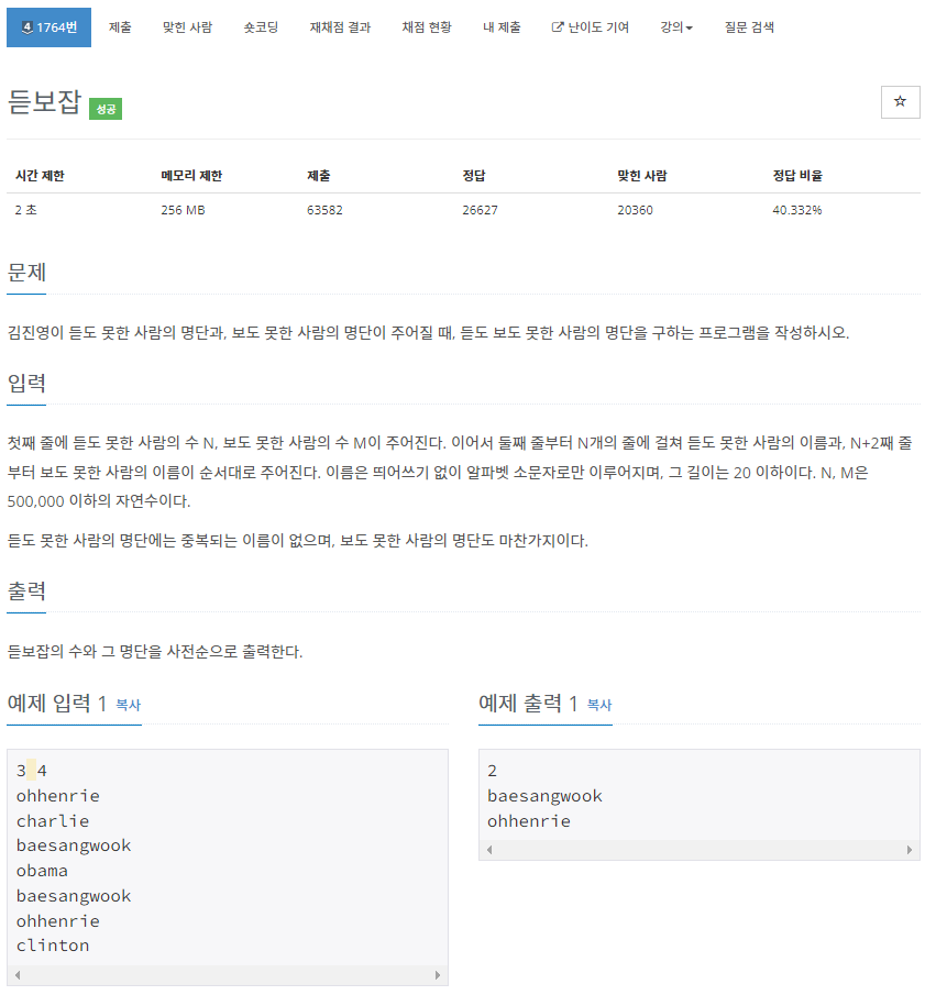 듣도 못한 사람을 모두 set에 넣고, 보도 못한 사람을 입력 받는 동시에 듣도 못한 사람에 속하는 지 비교 후 저장.