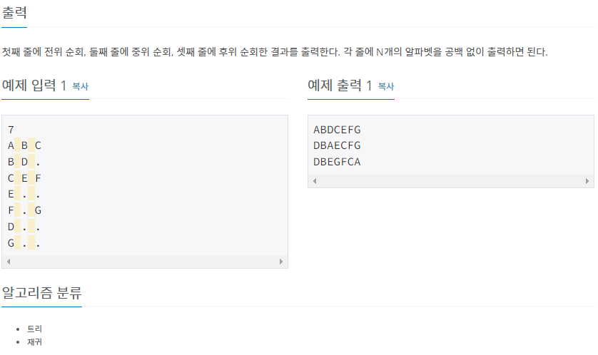 첫째 줄에는 이진 트리의 노드의 개수 N(1 ≤ N ≤ 26)이 주어진다. 둘째 줄부터 N개의 줄에 걸쳐 각 노드와 그의 왼쪽 자식 노드, 오른쪽 자식 노드가 주어진다. 노드의 이름은 A부터 차례대로 알파