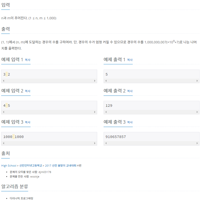 (1, 1)에서 (n, m)에 도달하는 경우의 수를 구하여라. 단, 경우의 수가 엄청 커질 수 있으므로 경우의 수를 1,000,000,007(=109+7)로 나눈 나머지를 출력한다.