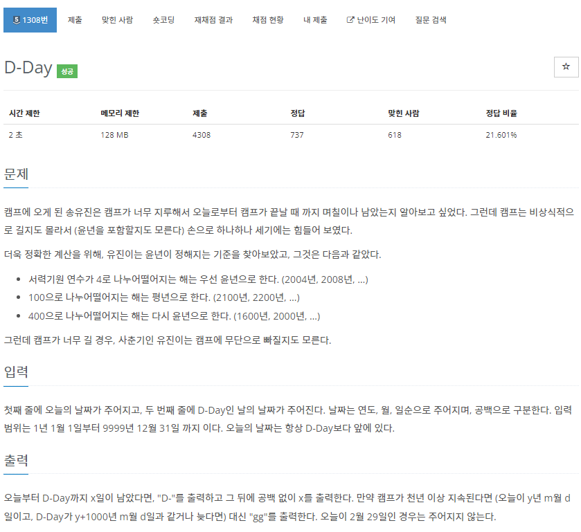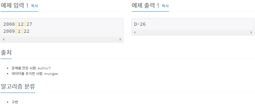 첫째 줄에 오늘의 날짜가 주어지고, 두 번째 줄에 D-Day인 날의 날짜가 주어진다. 날짜는 연도, 월, 일순으로 주어지며, 공백으로 구분한다. 입력 범위는 1년 1월 1일부터 9999년 12월 31일 까지 이다.