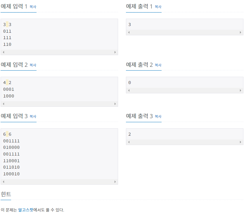 첫째 줄에 미로의 크기를 나타내는 가로 크기 M, 세로 크기 N (1 ≤ N, M ≤ 100)이 주어진다. 다음 N개의 줄에는 미로의 상태를 나타내는 숫자 0과 1이 주어진다. 0은 빈 방을 의미하고, 1은 벽을 의미