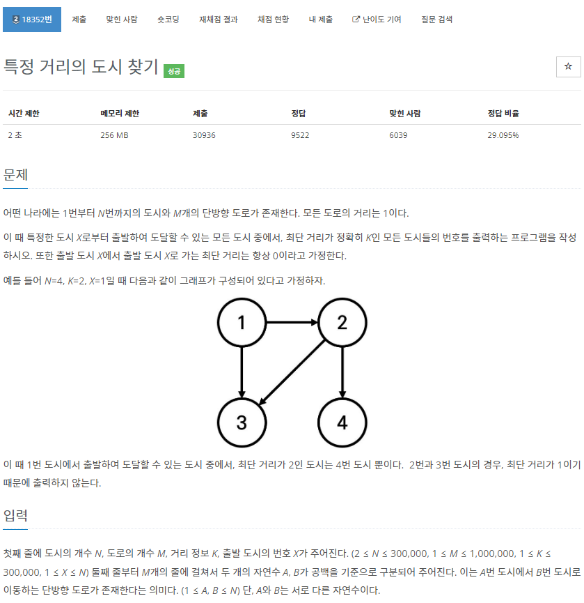 최단 거리 -> BFS 사용거리가 K인 도시를 찾았다면 오름차순 출력을 위해 우선순위 큐에 해당 도시를 삽입하고, 거리가 K 이상의 도시 정보는 필요하지 않으므로 큐에 삽입하지 않는다.코드