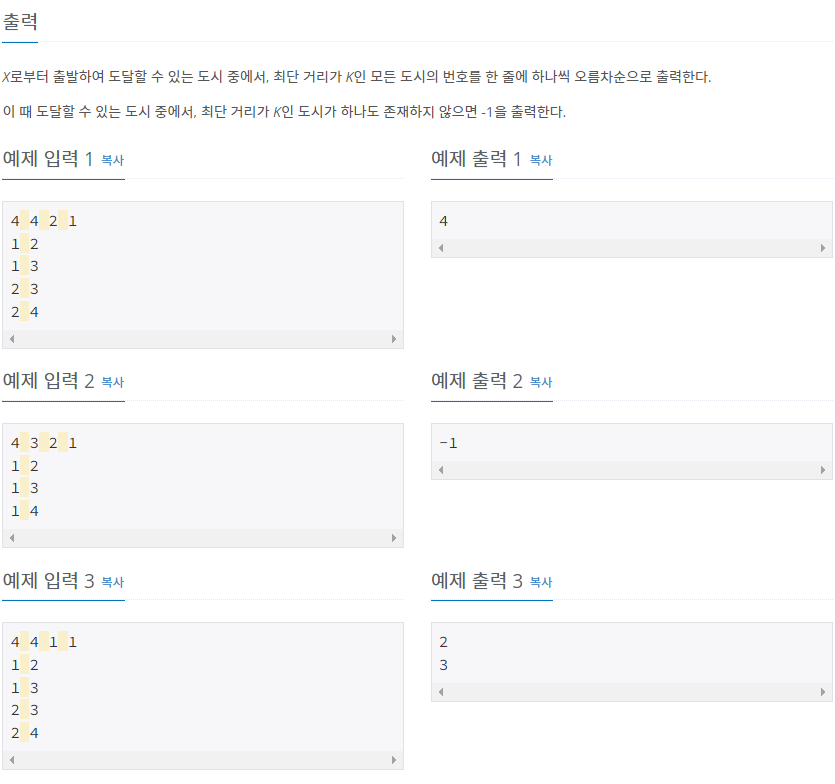 첫째 줄에 도시의 개수 N, 도로의 개수 M, 거리 정보 K, 출발 도시의 번호 X가 주어진다. (2 ≤ N ≤ 300,000, 1 ≤ M ≤ 1,000,000, 1 ≤ K ≤ 300,000, 1 ≤ X ≤ N) 둘째 줄부터 M개의 줄에 걸쳐서 두 개