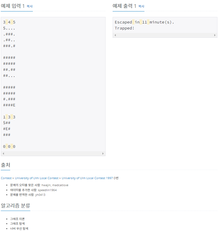 printf("Escaped in %d minute(s).\n", Sec[l][r][c] + 1);