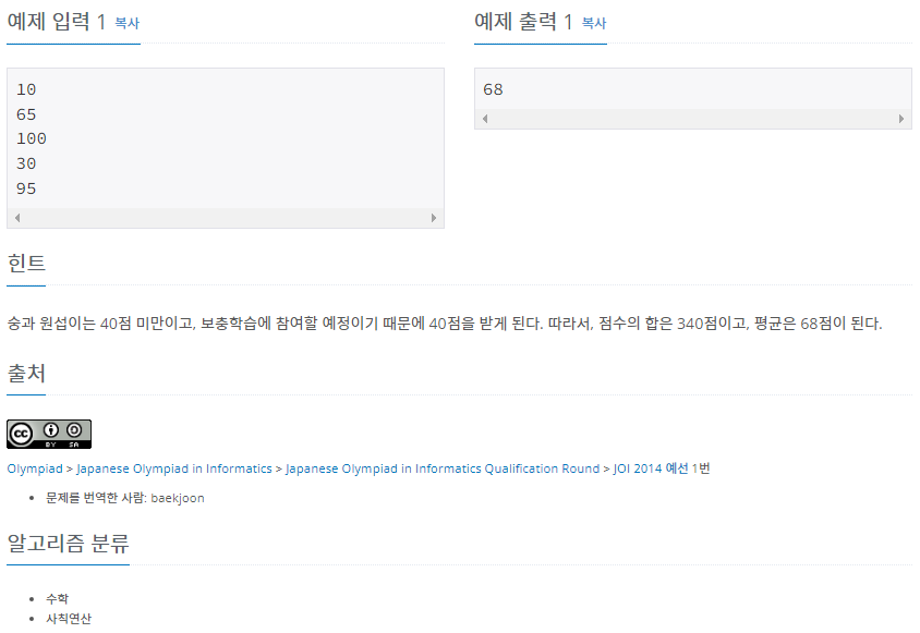#include <stdio.h> int main() { int score, sum = 0; for (int i = 0; i < 5; i++) { scanf("%d", &score); if (score < 40) score = 40; sum += score; } printf("%d", sum / 5); return 0; }