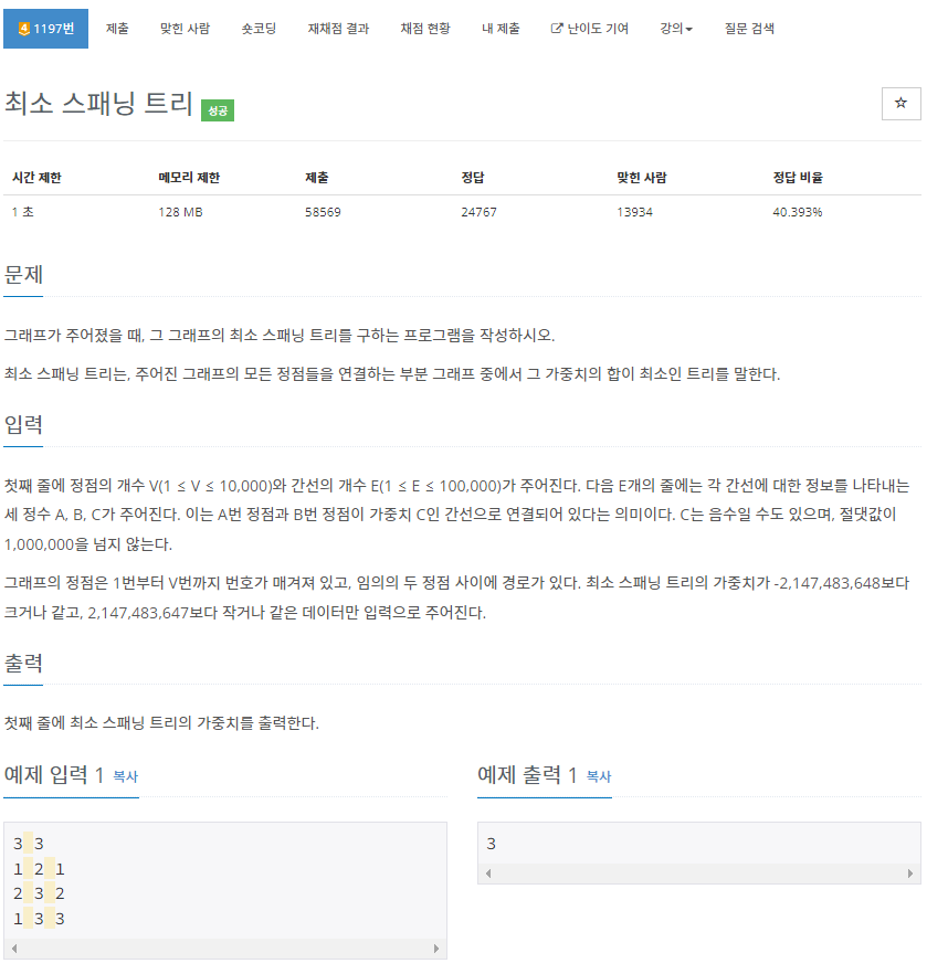 BOJ (C/C++) 1197번: 최소 스패닝 트리 본문