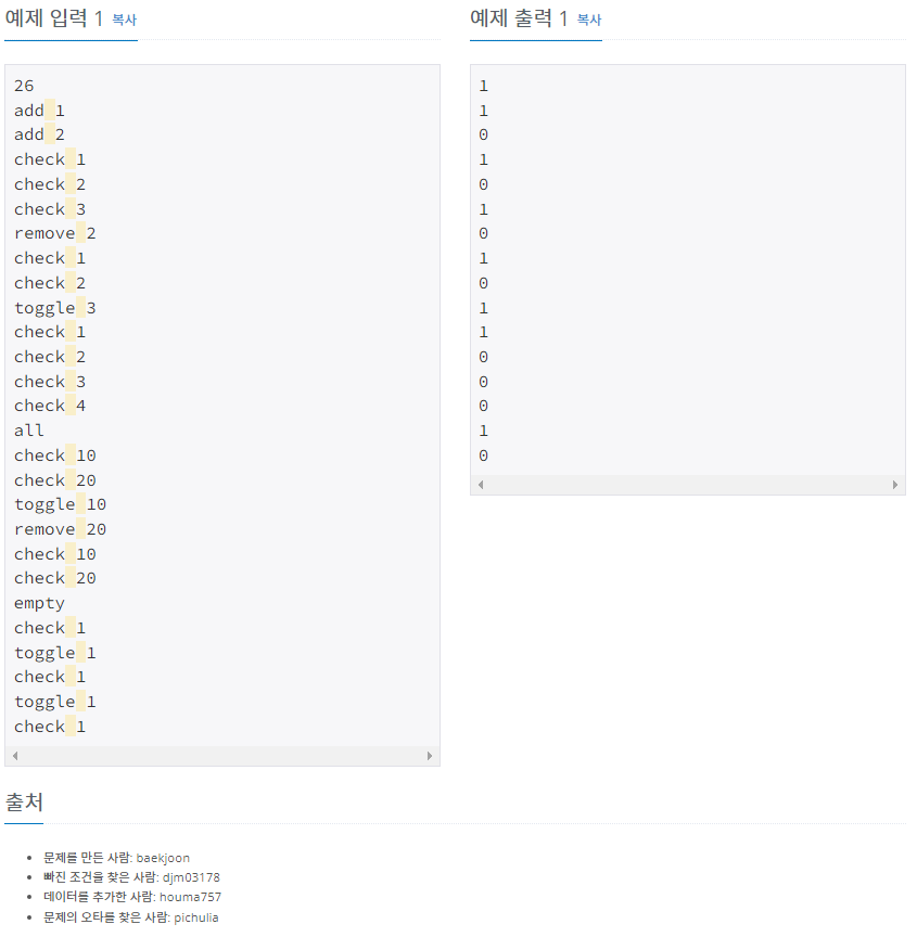 문제의 제목부터 집합이라 set을 사용하려 했으나 수의 범위가 1~20까지이기에 배열을 사용했다.또한 한 줄씩 입력 받으려고 cin.getline을 사용했는데 시간초과가 발생했고, scanf로 바꾸니 해결됐다.