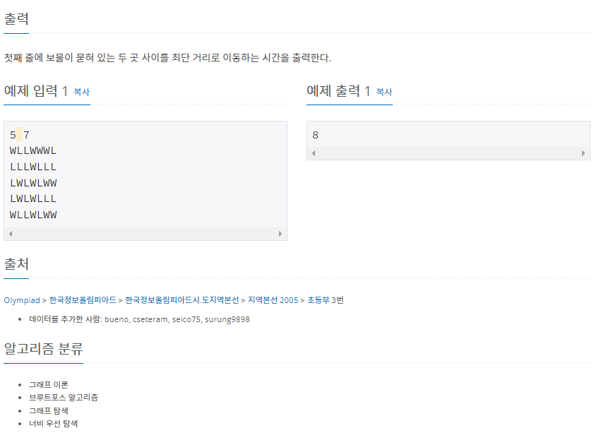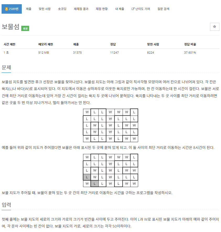 보물섬 지도를 발견한 후크 선장은 보물을 찾아나섰다. 보물섬 지도는 아래 그림과 같이 직사각형 모양이며 여러 칸으로 나뉘어져 있다. 각 칸은 육지(L)나 바다(W)로 표시되어 있다. 이 지도에서