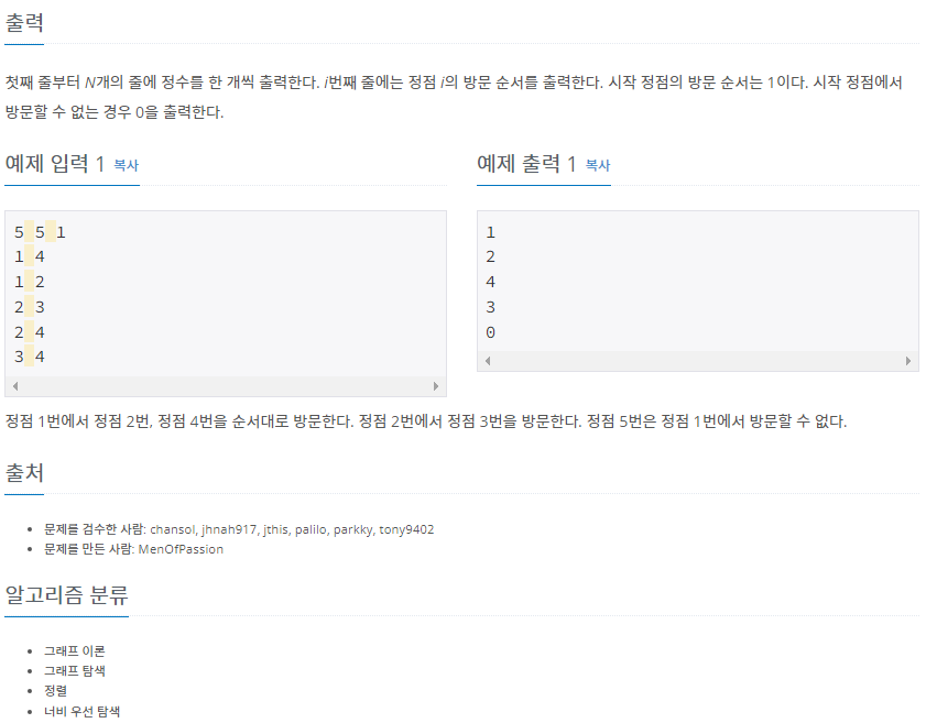입력 받은 후 각 노드를 오름차순으로 정렬한 후 BFS를 실행하였다. 방문한 기록이 없는 노드만 큐에 저장하고, cnt를 전역변수로 지정하여 큐에 노드를 삽입할 때마다 cnt를 하나씩 증가시키며 방문 순서를 저장하였다.