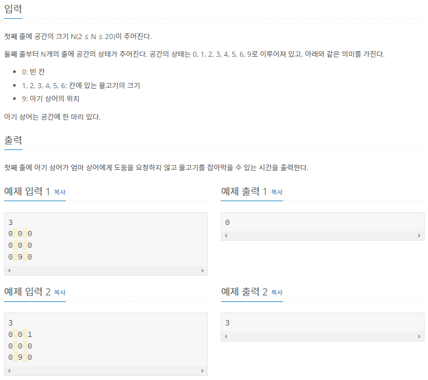 - 상어의 초기 위치의 값은 0으로, 항상 지나갈 수 있음