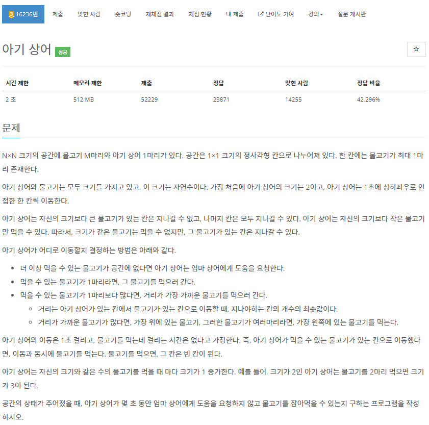 - 상어보다 큰 물고기가 있는 경우에는 길을 돌아가므로 단순히 현재, 미래 위치의 차이가 이동에 걸리는 시간이 아님