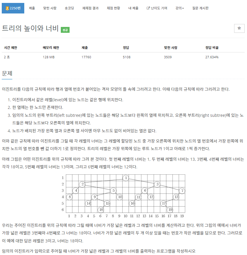 2250번: 트리의 높이와 너비