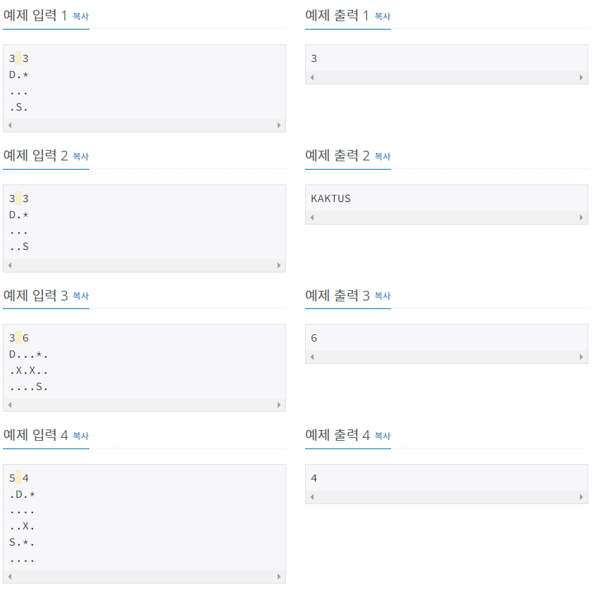 Route 함수: 시작지점(S) 부터 해당지점에 도달하는 시점을 저장 - BFS물이 차있거나 찰 예정인 지점은 갈 수 없음탐색 중 도착지를 만났다면 해당 시간을, 만나지 못했다면 KAKTUS 출력