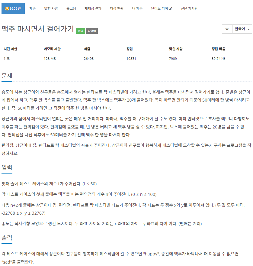 편의점에 들를 땐 최대 20병씩 맥주를 채울 수 있음 >> 거리가 1000m 이하일 경우 도달할 수 있음한 번 방문하여 큐에 삽입된 지점은 다시 가지 않음>> 이 부분이 잘 이해가 안 갔는데 1-2의 루트가 있고 1-3-2의 루트가 있으면 1-3-2는 1-2에 포함되므로 안 따져도 되는 듯??이 문제는 루트를 찾는 것이 아닌 갈 수 있는지의 여부만을 물어보는 문제라 이 부분은 안 따져도 될 것 같음또한 큐에 삽입된 지점만 재방문이 안 되므로 괜찮은 것 같음(아니라면 댓글로 알려주세요ㅠ)