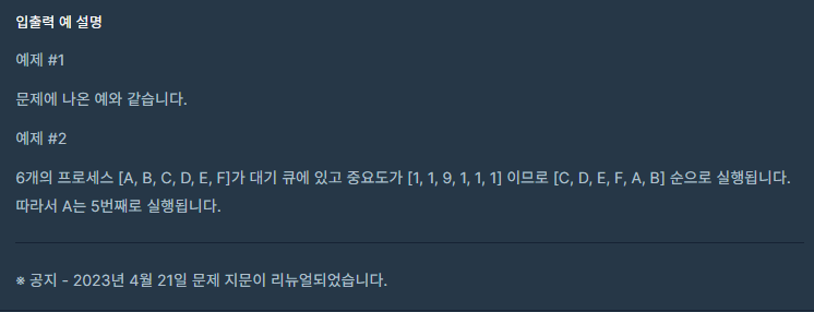 큐는 인덱스로 접근이 안 되므로 priorities에서 가장 큰 값을 찾았고, 이 때 해당되는 인덱스 값도 같이 return했다.