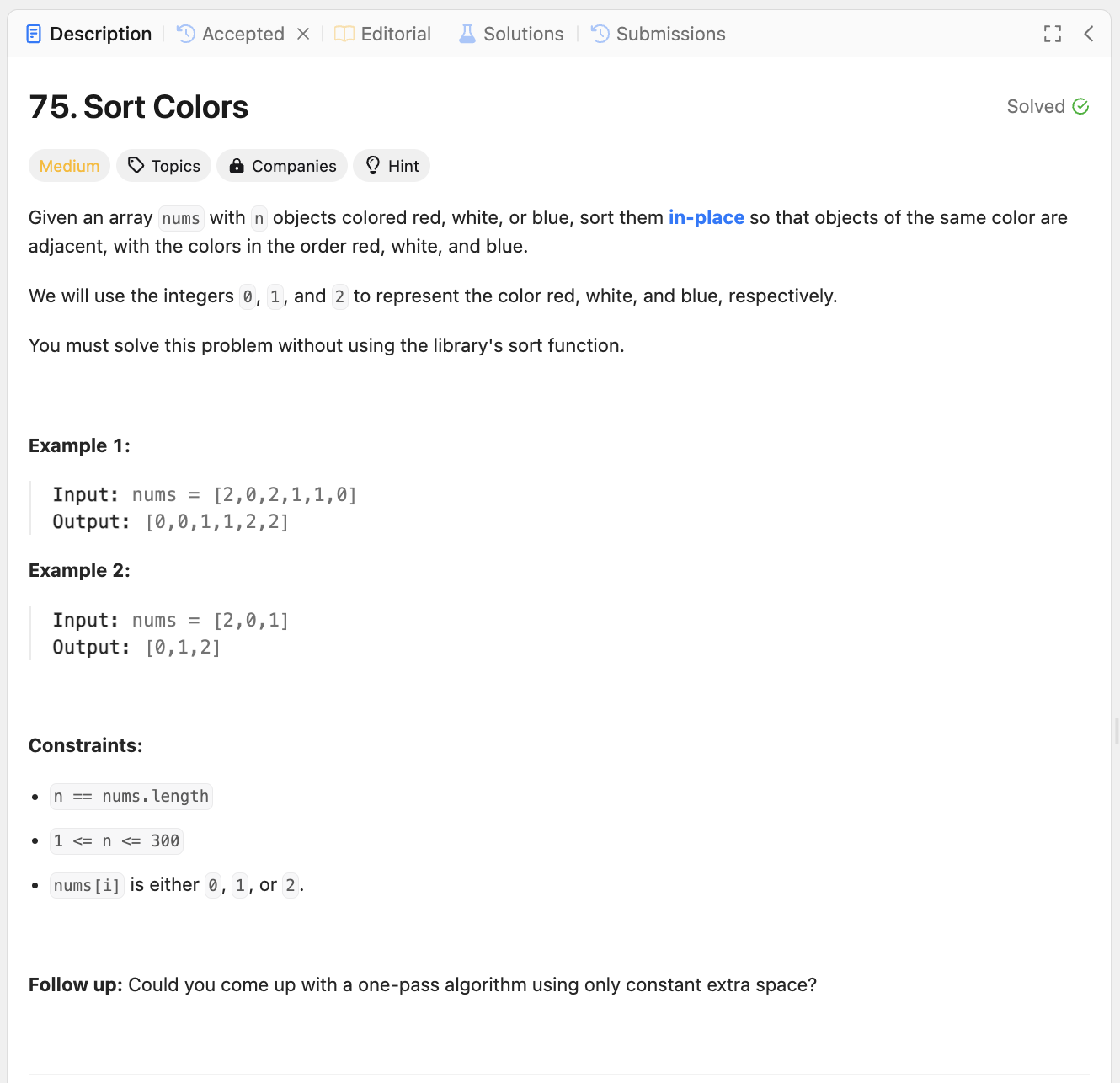 공간복잡도가 상수이어야 하고, 색은 {0,1,2} 3개로 나타내는 방식이라, 3칸짜리 배열에 색의 정보를 저장했다.