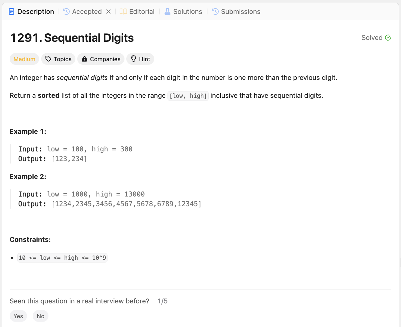 LeetCode (C/C++) 1291. Sequential Digits 본문