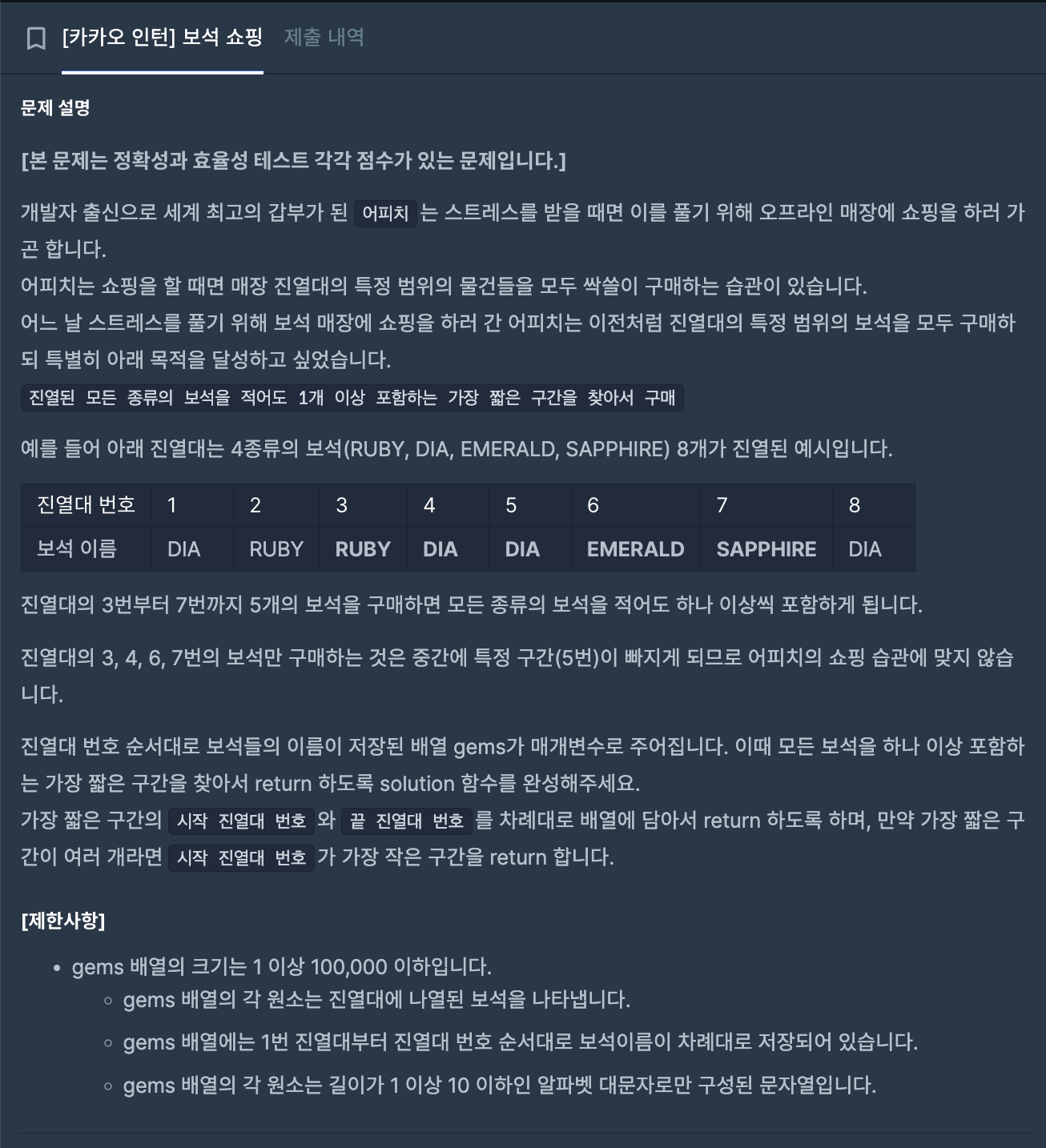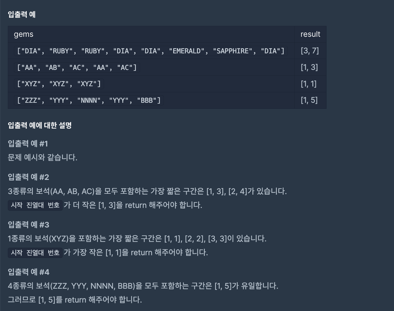이후 end를 늘려가며 현재 범위에 모든 보석이 들어 있는지를 확인했다. 이후 start를 늘리며 start에 위치한 보석을 제외해도 현재 범위에 모든 보석이 들어 있는지 확인한다. 이 범위의 최소 값을 구해 반환했다.