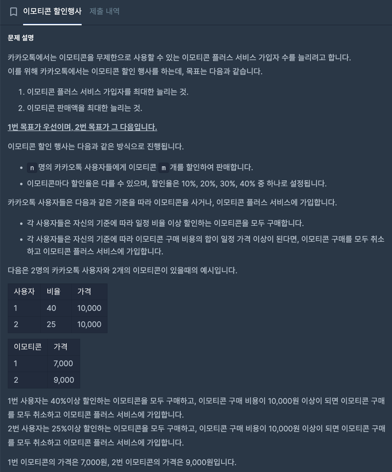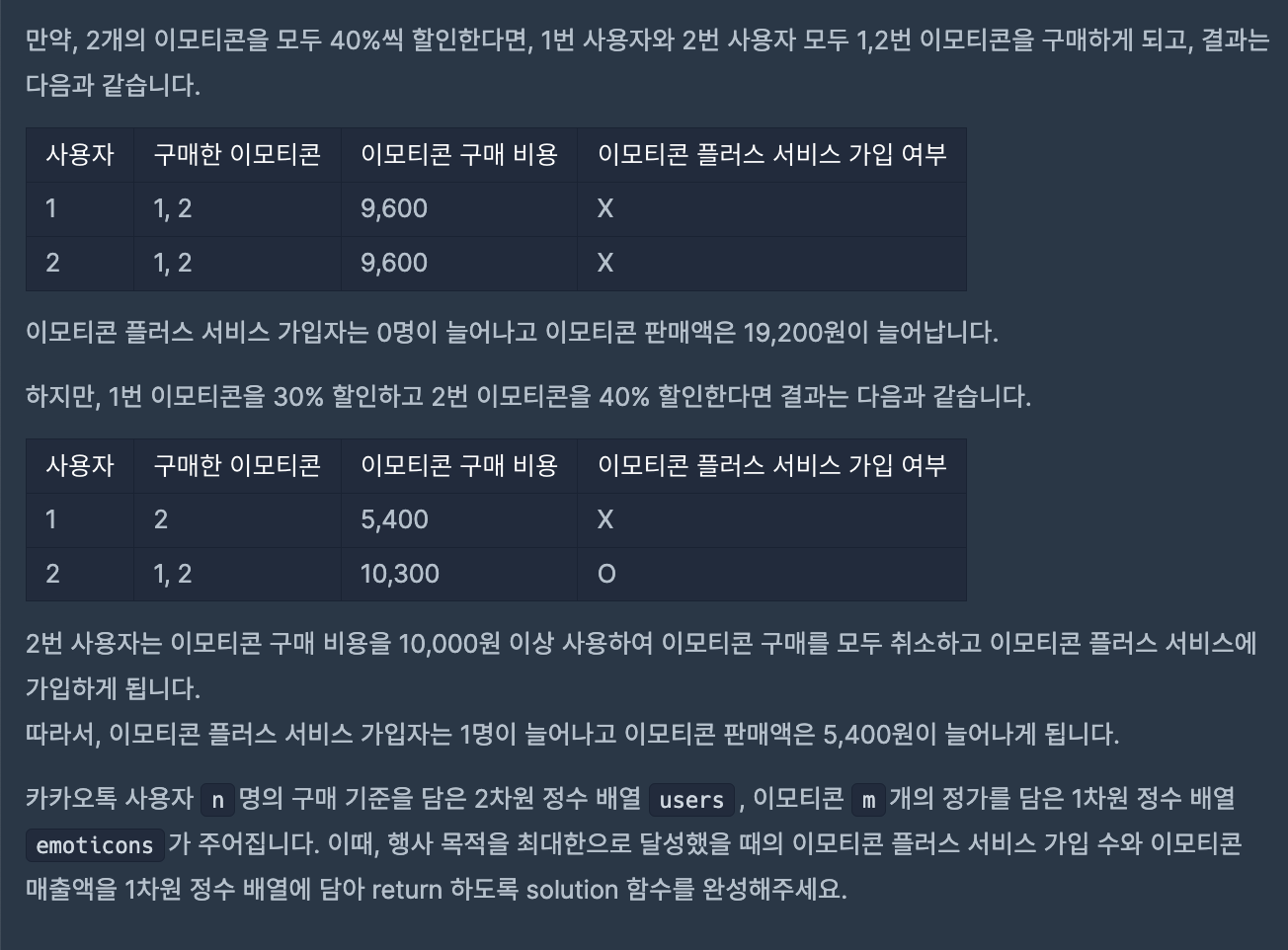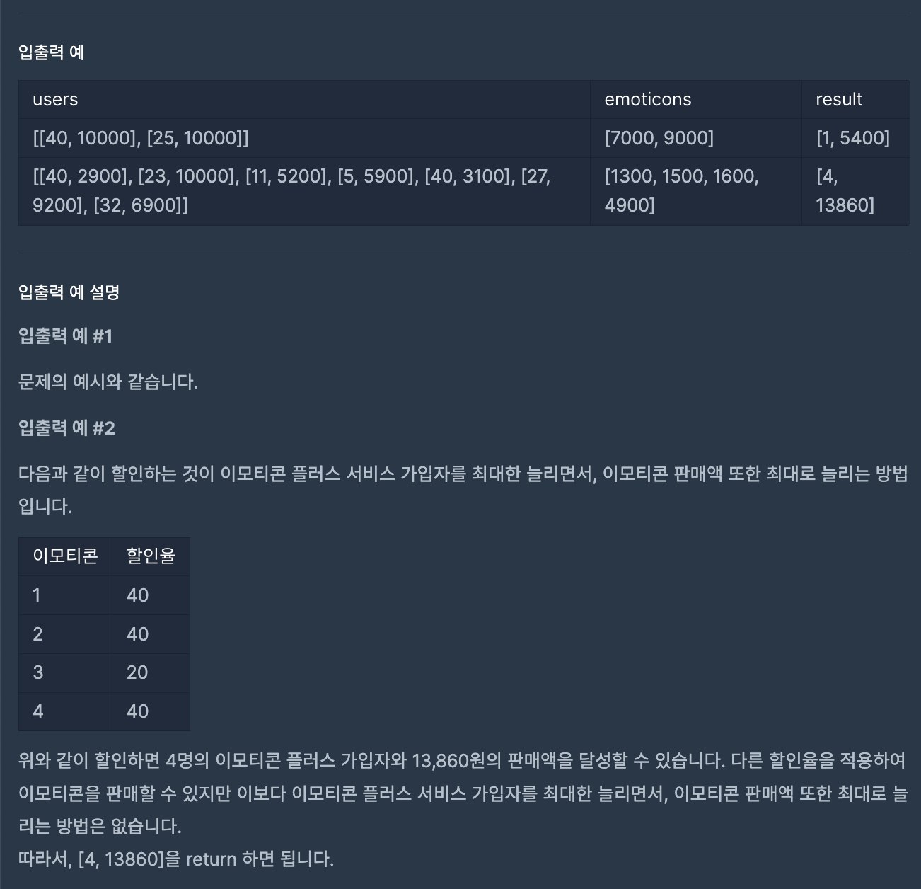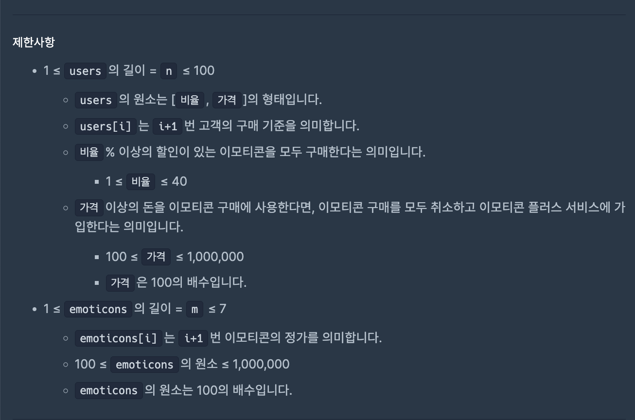 이 경우 emoticon 하나당 적용할 수 있는 할인율은 0% ~ 40%까지 총 5가지이므로 모든 경우의 수를 확인해도 200만이 되지 않아 완전탐색으로 답을 구했다.
