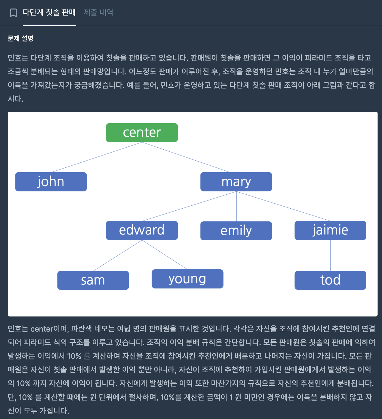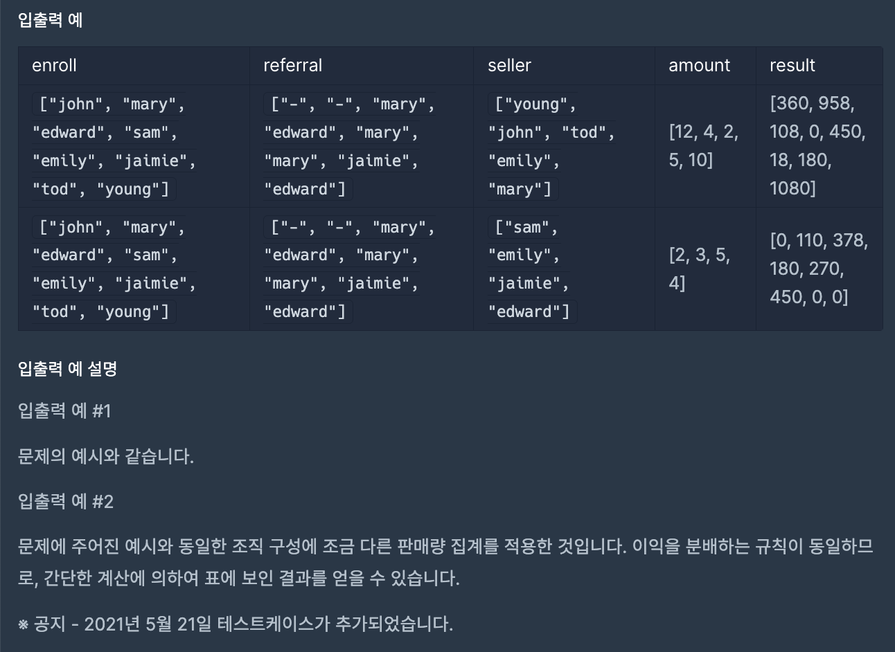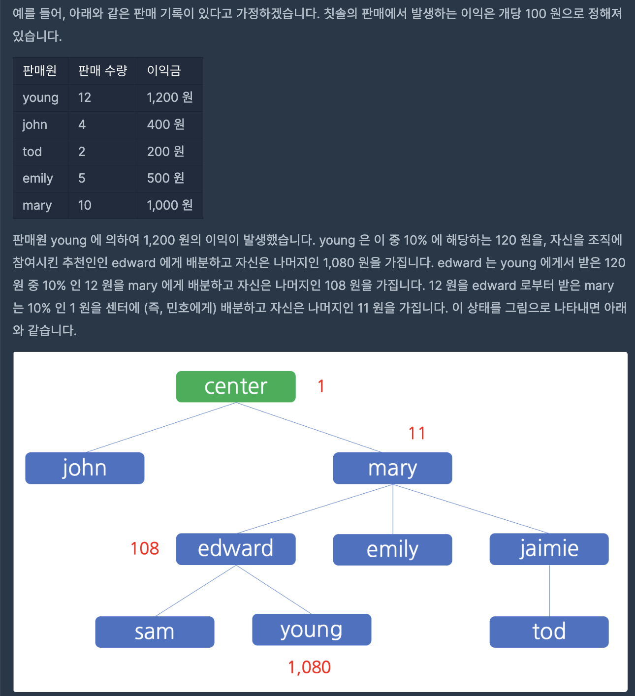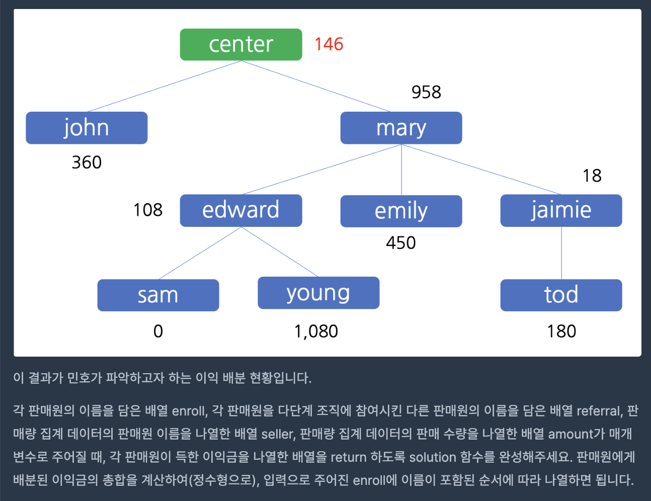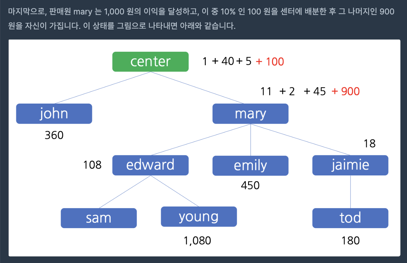 처음에는 amount 값을 한 번에 정리하고, 구조도의 제일 밑 부분부터 확인하며 income 값을 갱신해줬다.