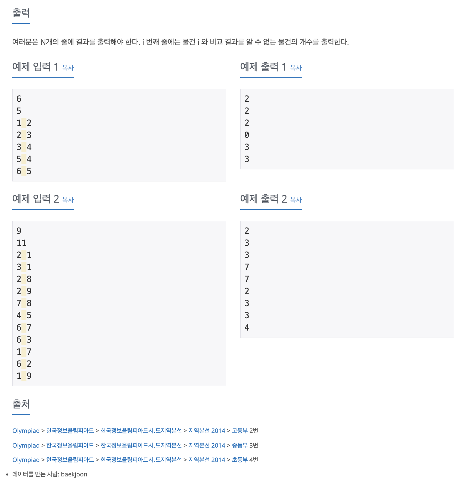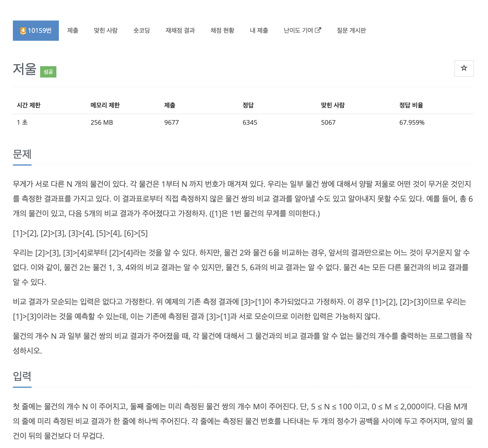 #10159 저울 난이도 : 골드 3 유형 : 그래프/ 플로이드-와샬 10159번: 저울 첫 줄에는 물건의 개수 N 이 주어지고, 둘째 줄에는 미리 측정된 물건 쌍의 개수 M이 주어진다. 단, 5 ≤ N ≤ 100 이고, 0 ≤ M