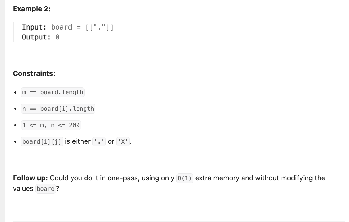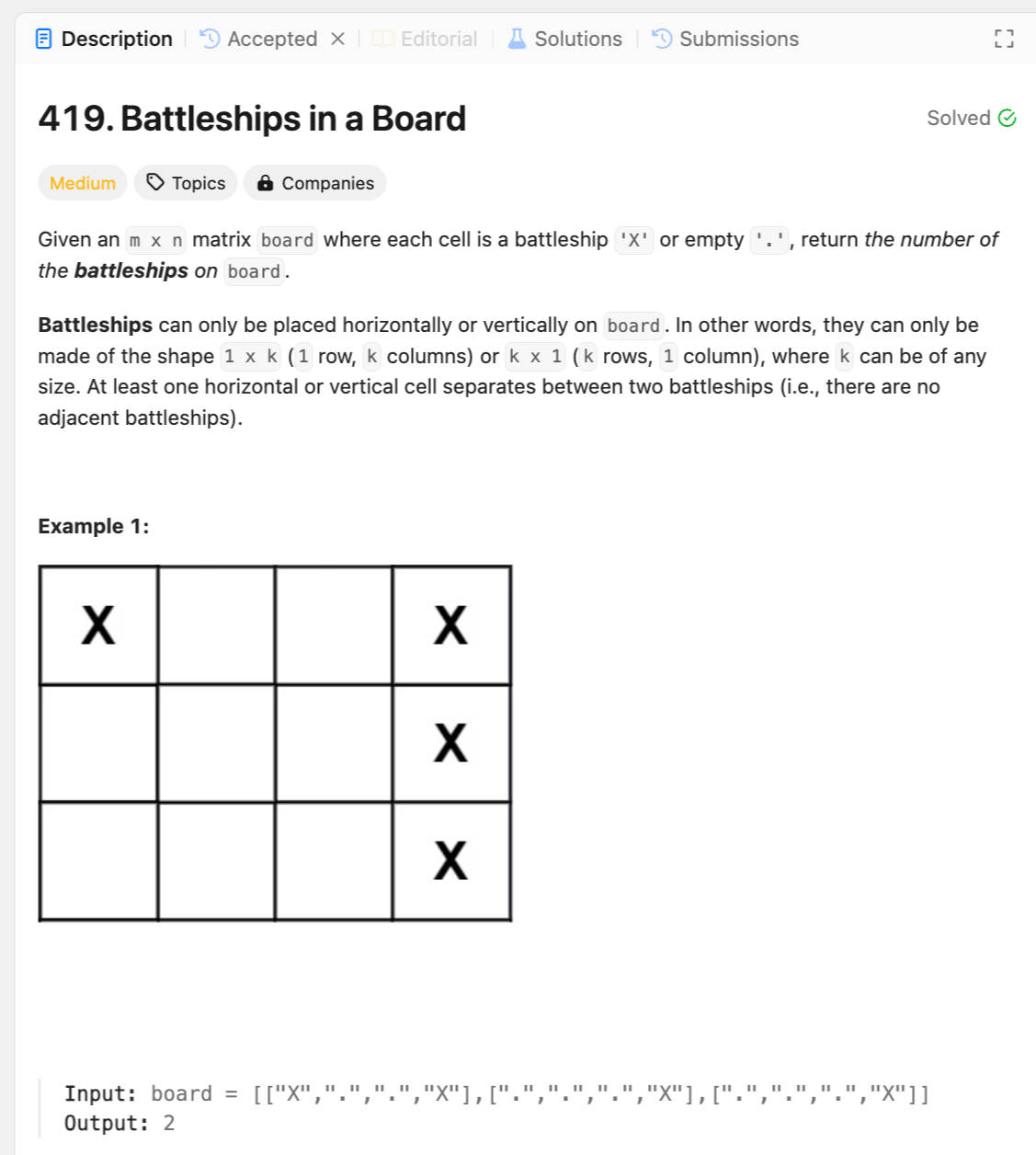 주어진 battleship은 수직 혹은 수평으로만 주어지기에 위에서부터 순회하며 현재 셀에 battleship이 있고, 해당 셀의 위쪽 혹은 왼쪽이 X가 아니라면 즉, 이미 카운팅된 battleship이 아니라면 카운트 해 답을 구했다.