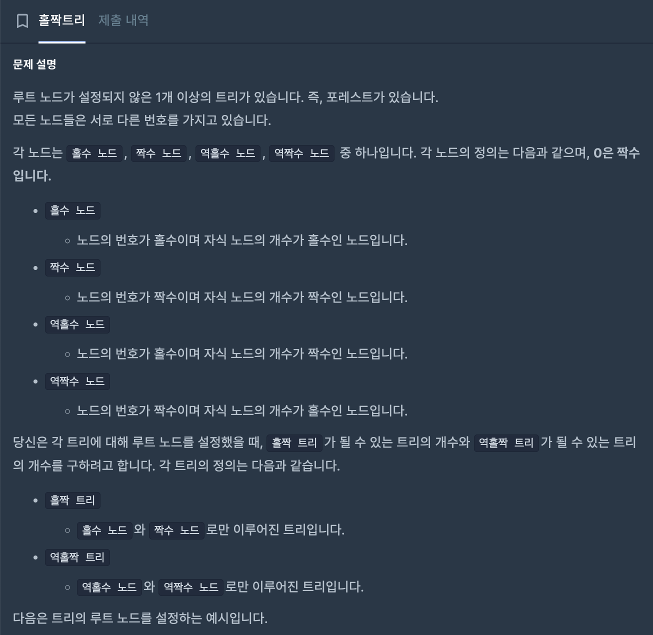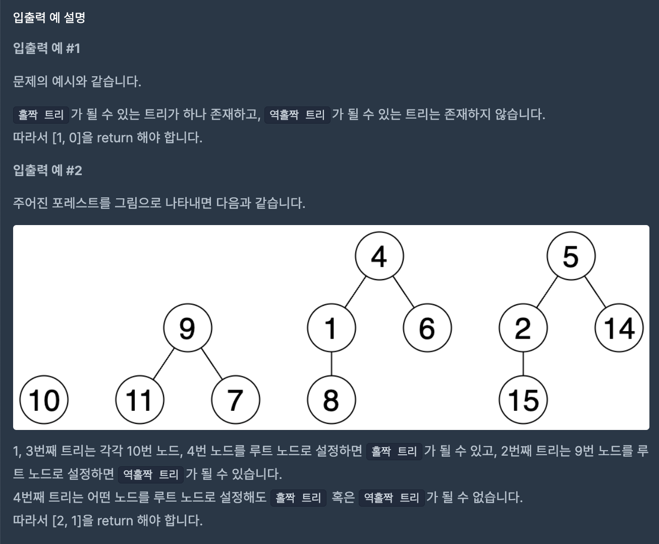 따라서 트리 내부의 모든 노드를 확인하며 홀짝/역홀짝 노드의 개수를 구해 홀짝/역홀짝이 1개인 경우 해당 트리를 역홀짝/홀짝으로 구분하였다.