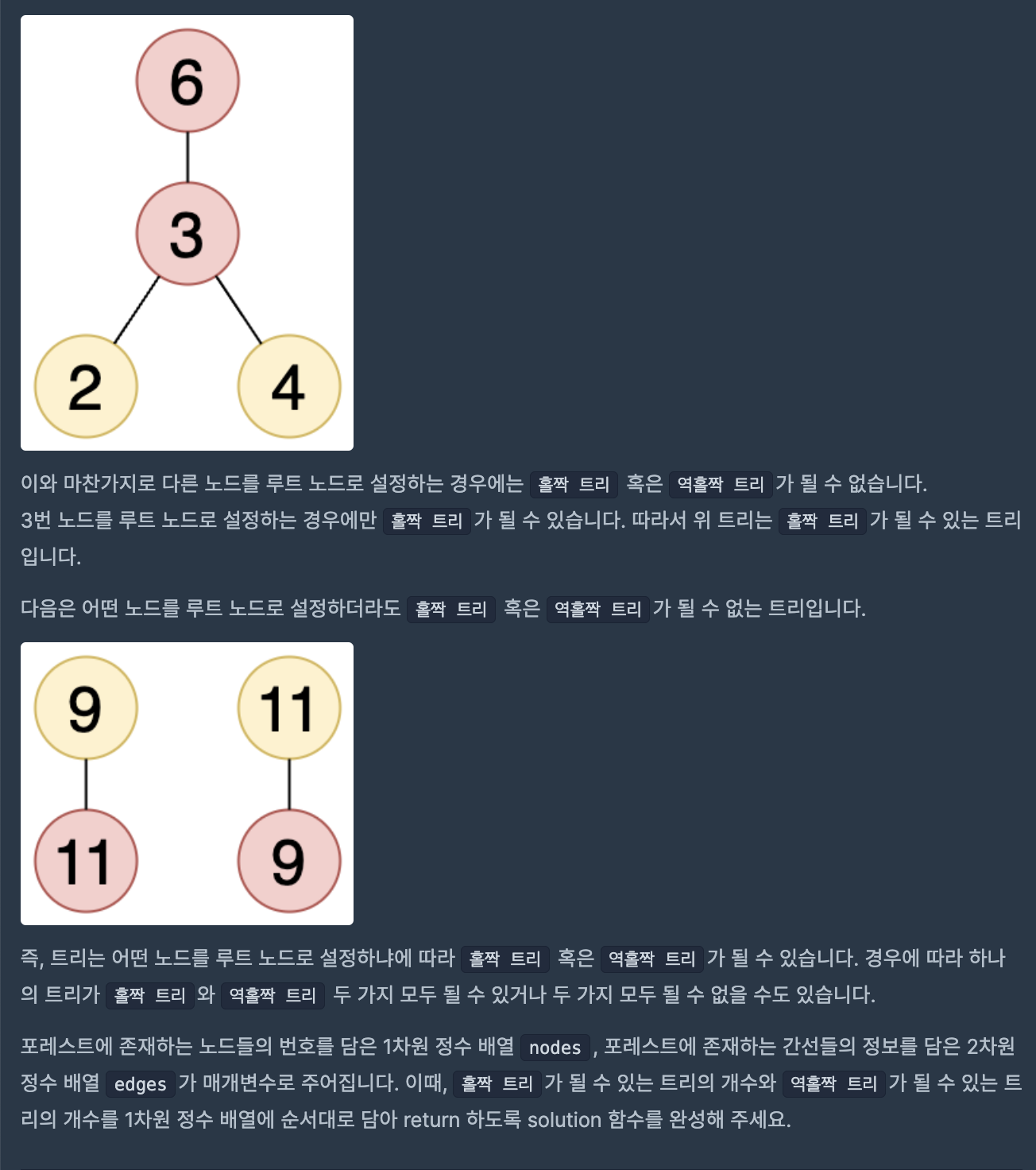 그렇다면 해당 트리를 모두 루트가 아니라 가정했을 때 노드 하나를 제외한 모든 노드가 홀짝/역홀짝이라면 해당 노드를 루트로 지정했을 때 트리 전체가 홀짝/역홀짝이 된다.
