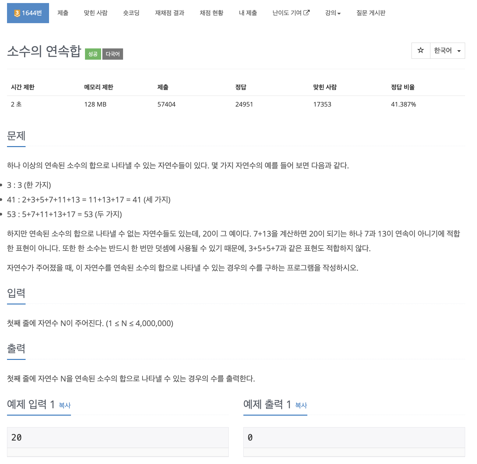 BOJ (Java) 1644번: 소수의 연속합 본문