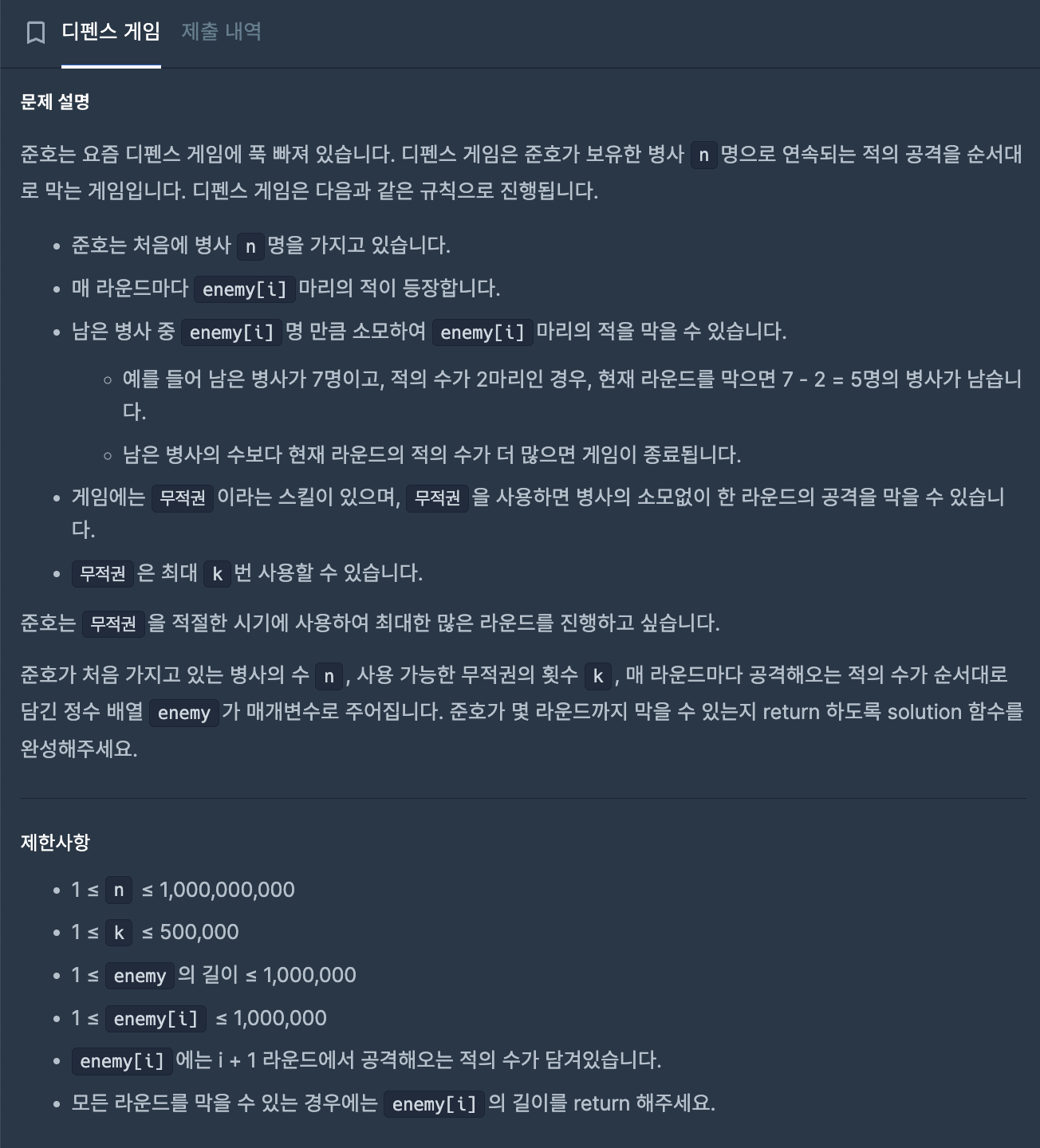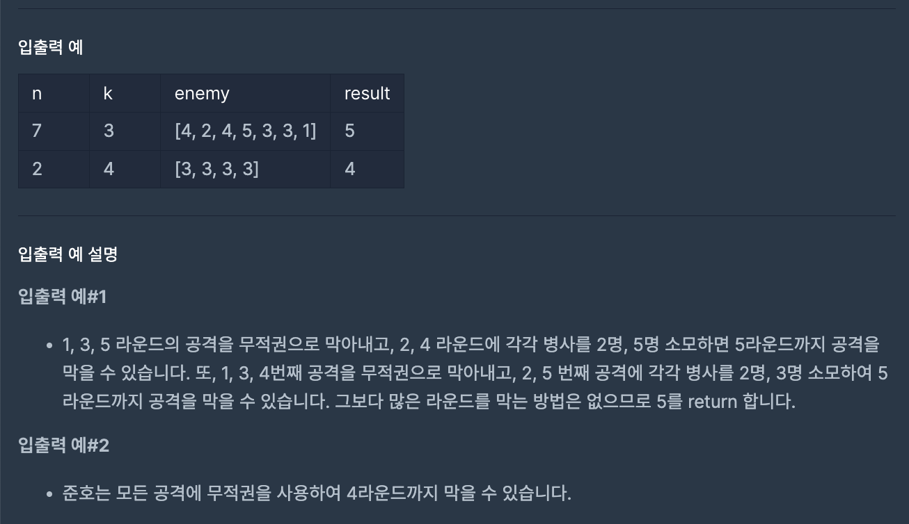 우선순위 큐를 사용, 막을 수 없을 때는 현재까지 나온 값 중 가장 큰 값에 무적권을 사용했다고 판단, 병사를 복구하여 다시 탐색했다.