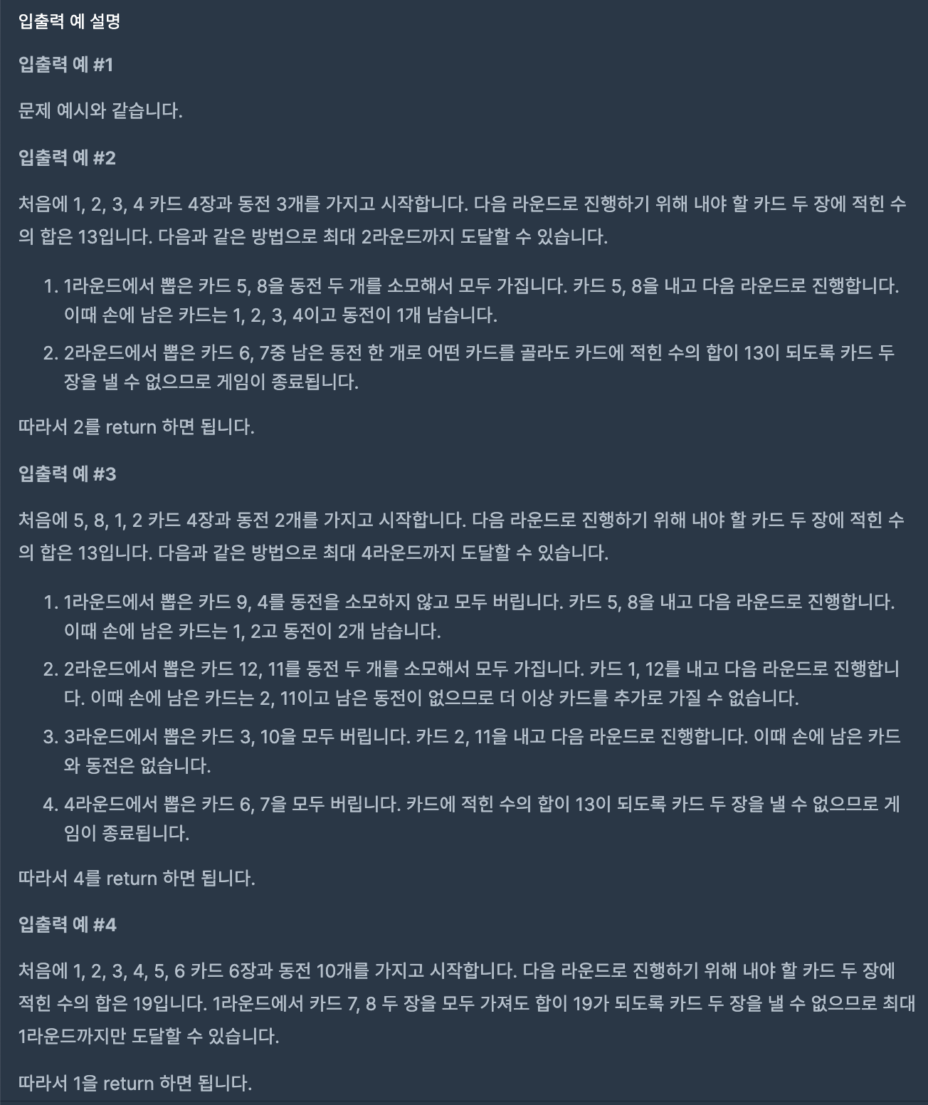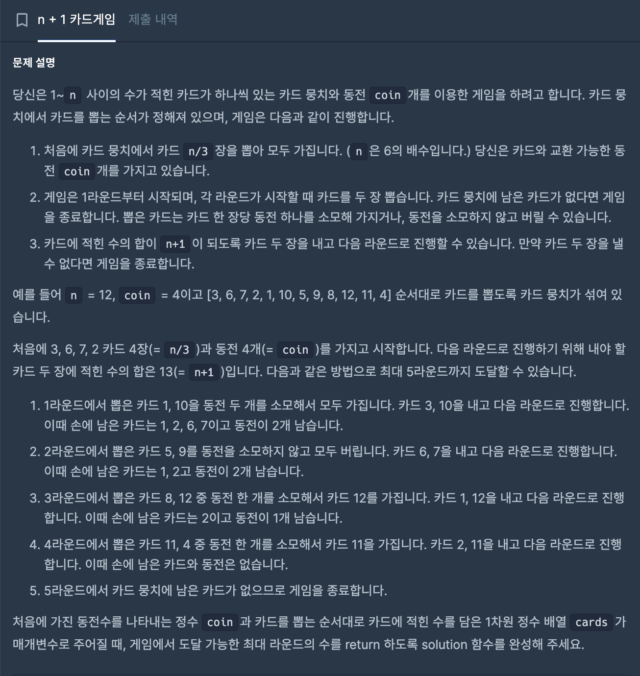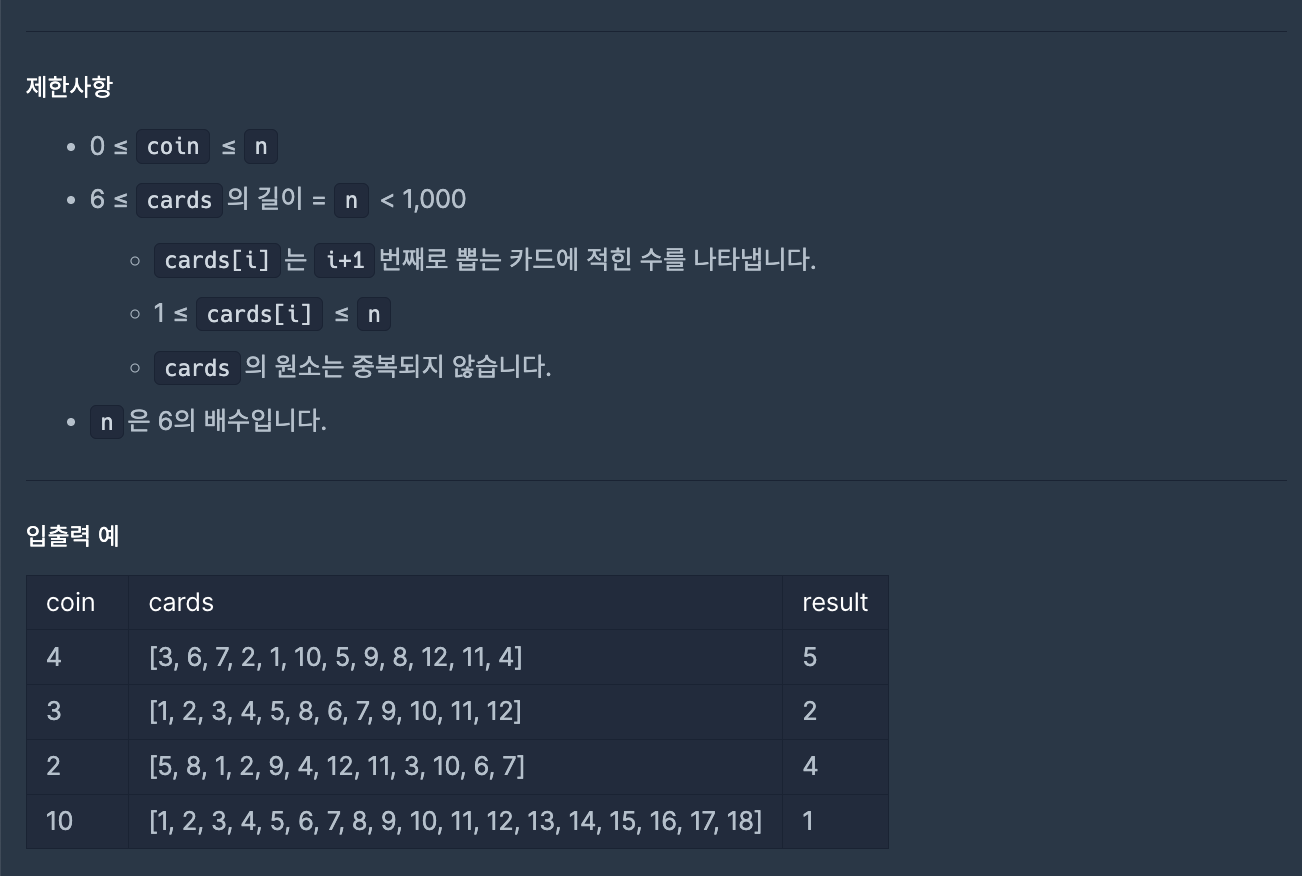https://school.programmers.co.kr/learn/courses/30/lessons/258707처음에 가진 동전수를 나타내는 정수 coin카드를 뽑는 순서대로 카드에 적힌 수를 담은 1차원 정수 배열 cards게임에서 도달 가능한 최대 라운