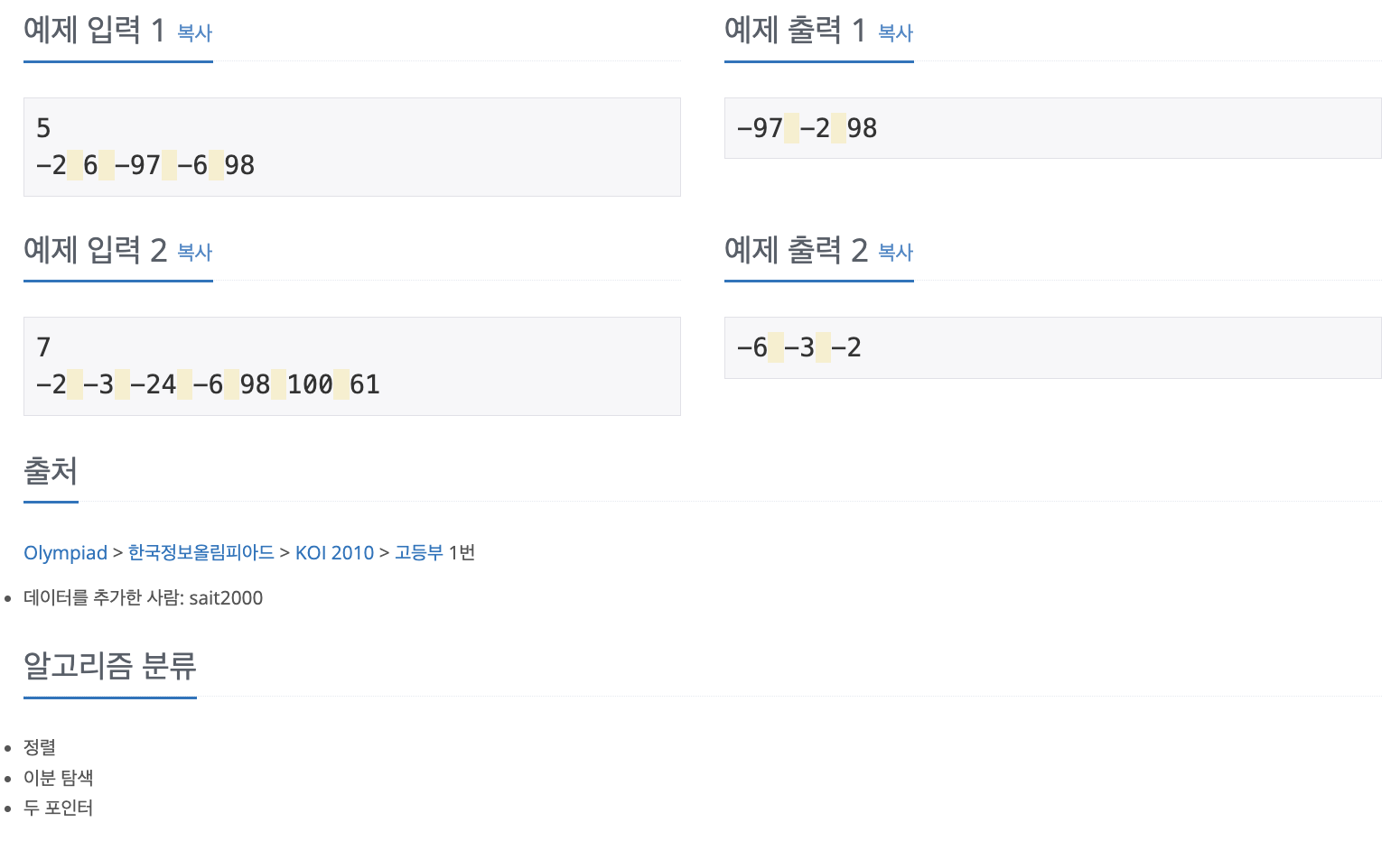 // 오름차순으로 정렬 후 하나의 숫자를 기준으로 삼아 투 포인터 실행