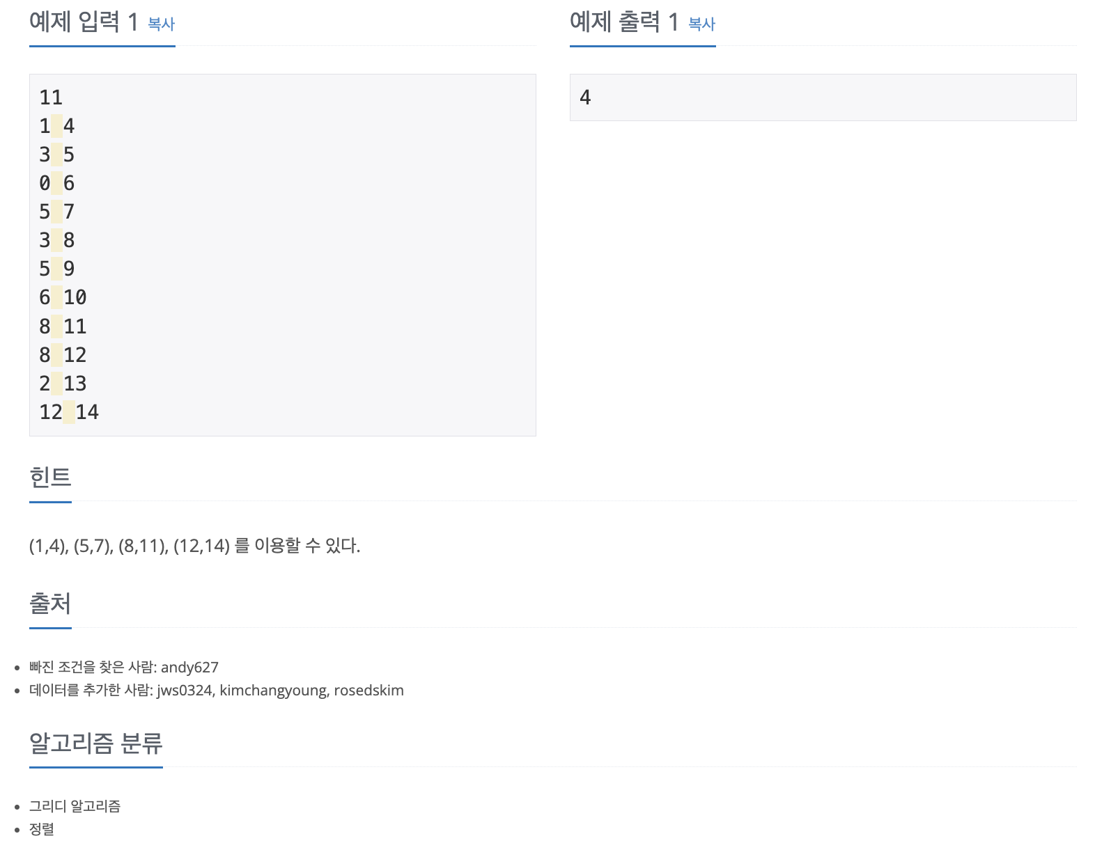 시작 시간과 끝나는 시간이 같은 회의도 있기에 끝나는 시간이 같다면 시작 시간이 작은 순으로 정렬했다.