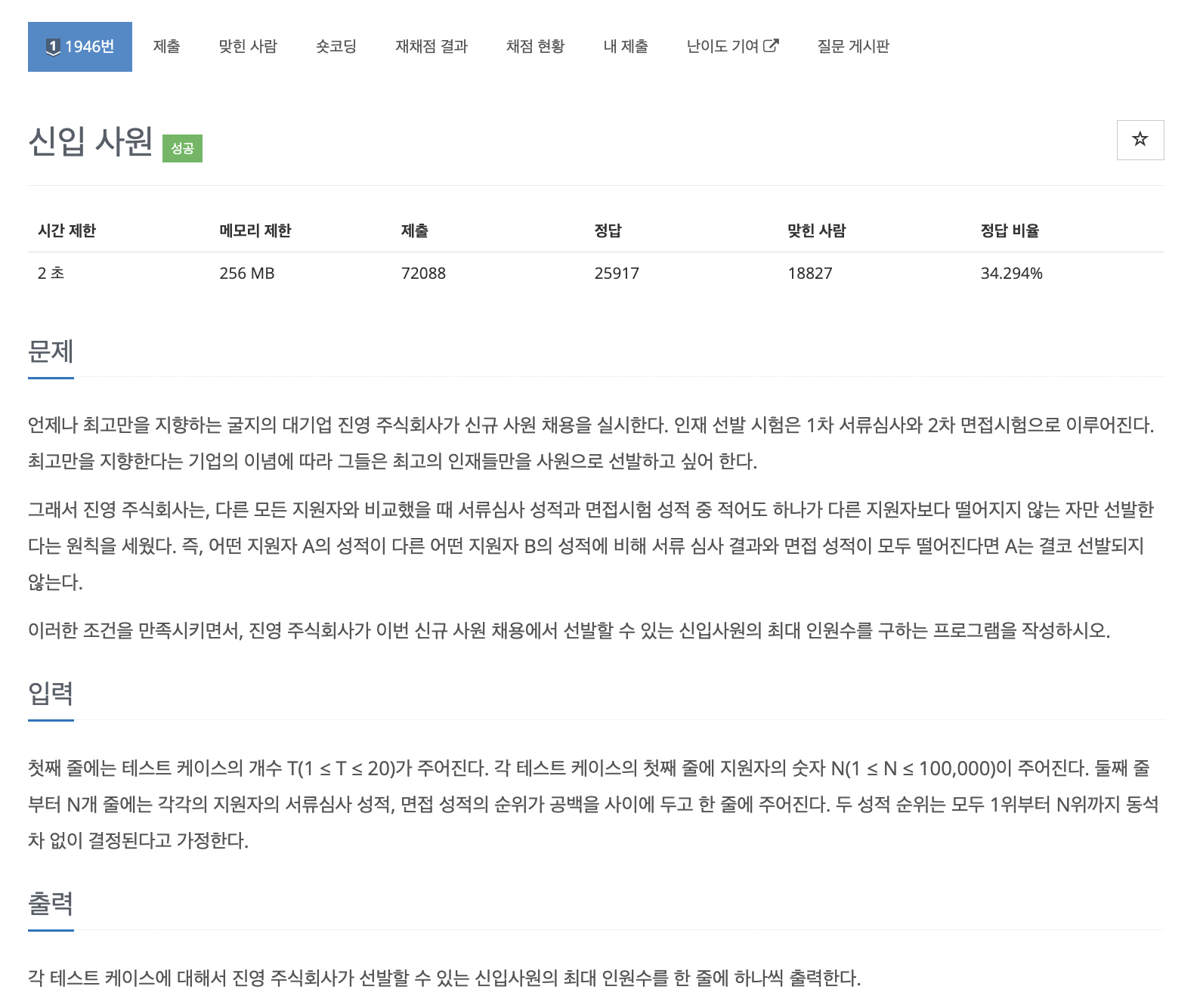 이렇게 되면 서류 심사는 무조건 높은 사람부터 탐색할 수 있으므로, 면접 심사 순위만 비교하면 된다.