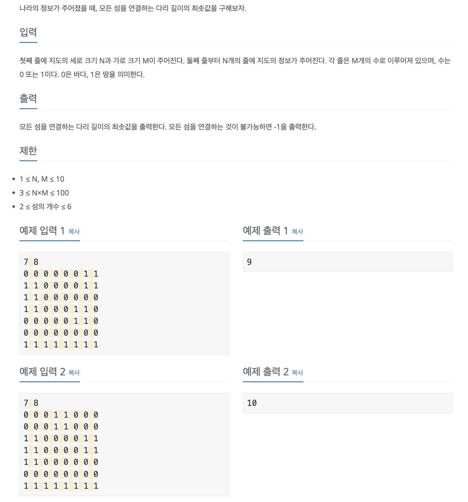 나눈 후 섬인 곳에서 다른 섬까지의 길이를 찾는다. 이 때 길이 꺾이면 안 되므로 4방향으로 이동한 후, 다른 섬이 있다면 [출발, 도착, 길이]를 저장한다.